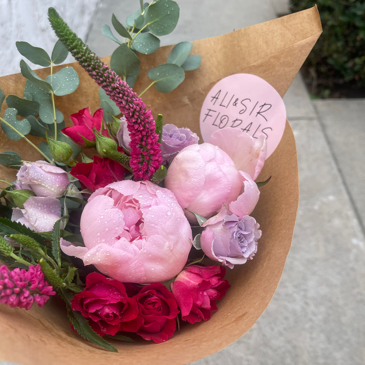 Each bouquet is thoughtfully designed with seasonal flowers and colors, creating a one-of-a-kind arrangement every time. Bouquets are wrapped in natural brown kraft paper, tied with twine and a coordinating accent color for an elegant, organic finish. A handwritten hangtag featuring your personal message and care instructions is included with every order, adding a meaningful and personal touch.